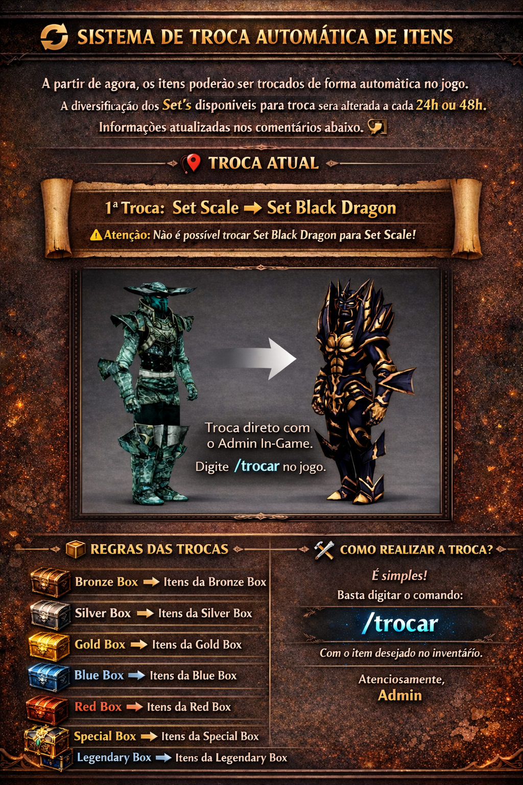 Observação: Cada parte só é trocada pela mesma parte! Somente itens Full +0 direto que dropa da box, se tiver +1 +2 não vai funcionar...